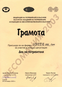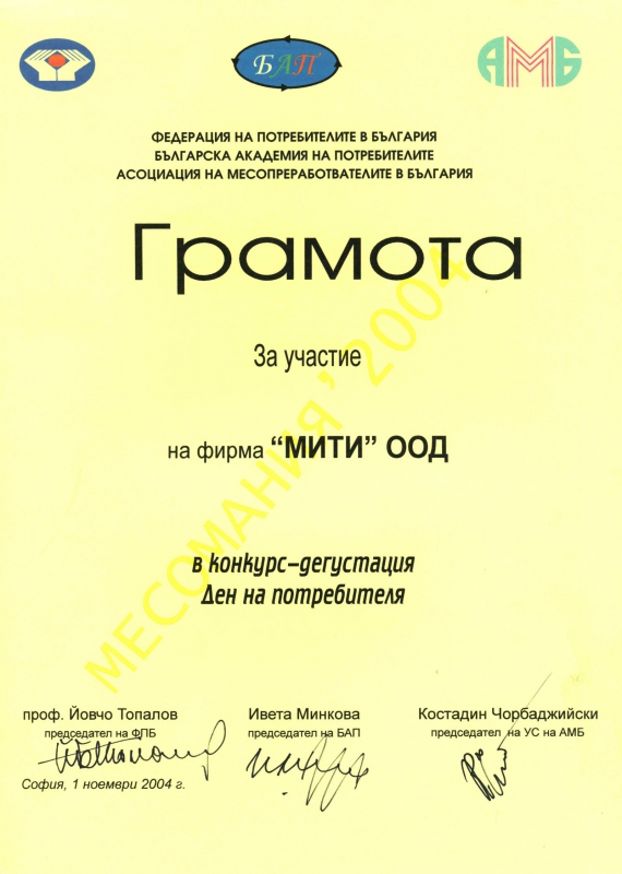 The company’s track record also features a LONG LIST OF PRESTIGIOUS awards from specialized exhibitions for meat and meat products. A bronze prize from "Montana Expo", “Customer satisfaction" 2000, a Certificate of Merit from "Customer satisfaction" 2001 - Montana, awards and prizes from the International Specialized Exhibition “Meatmania”. The following products stood out and brought us a high prize in the individual categories: Kaiser jerky, Nadenitsa “Tsarska” Nadenitsa “Shopska”, smoked fillet. Out top-rated product "Gornooryahovski sudzhuk" earned the first place in the Meatmania 2004 exhibition. In the category “The secret of Bulgarian taste" our “Smoked fillet” product was awarded a certificate from the Federation of Consumers in Bulgaria in collaboration with BAB and AMB.